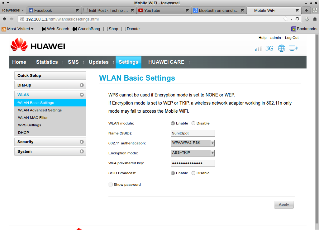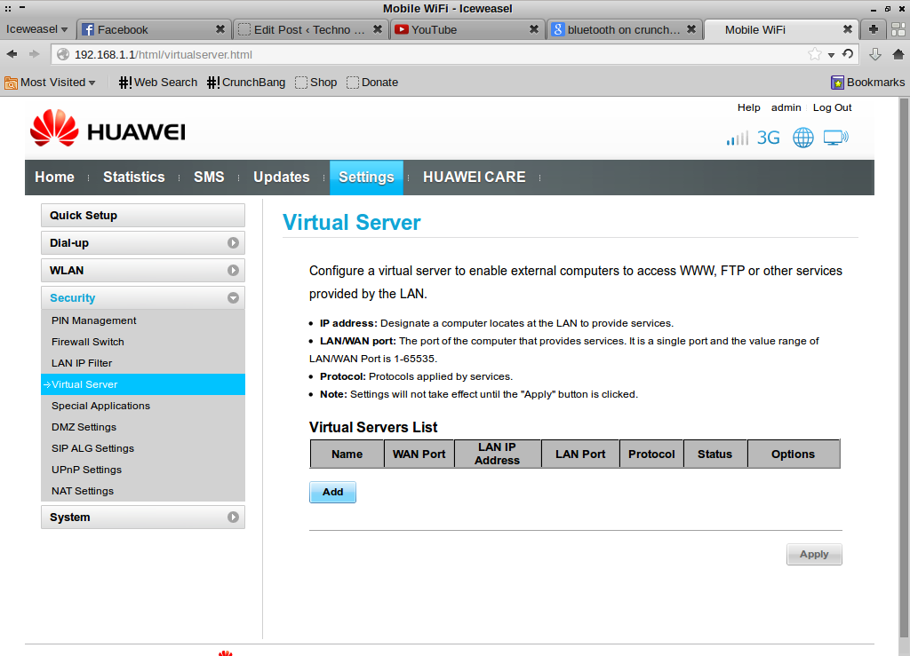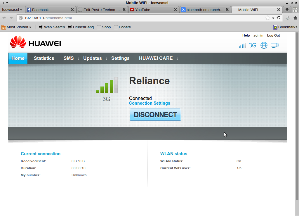 Managing the dongle is done via a web interface it provides, which by default can be accessed at http://192.168.1.1/. A couple of screenshots of the web interface is given below. Click on any picture to enlarge it.
