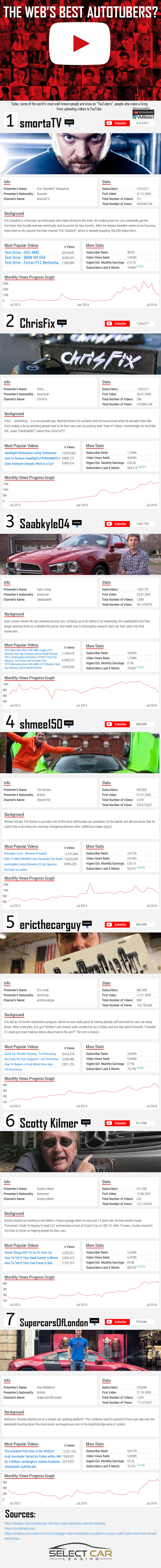In this infographic we take a look at the 7 best and biggest automotive YouTubers. We’ve included the viewing figures they achieve, their subscriber count and lots of other statistics that we think you’ll find QI (quite interesting). And, should you be wondering which of their videos are viewed the most we’ve included those figures too.