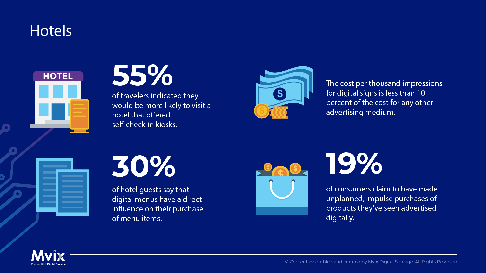Digital signage is able to play videos or music but knowing what works best for your hotel will maximize your ROI. Generally, news is a very safe choice as it will both entertain and inform travelers as they wait.